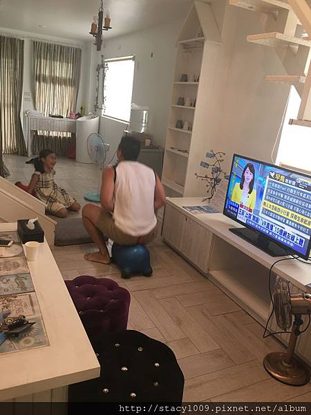 蓉無論喝水或看電視都要騎著她的跳跳馬,
