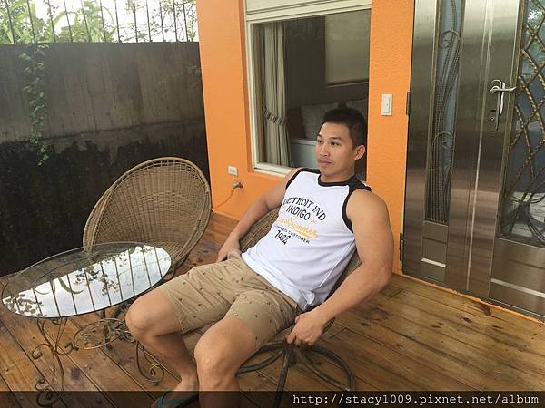 一清早起床,Leo 坐在庭院外,輕鬆自在享受悠閑,
