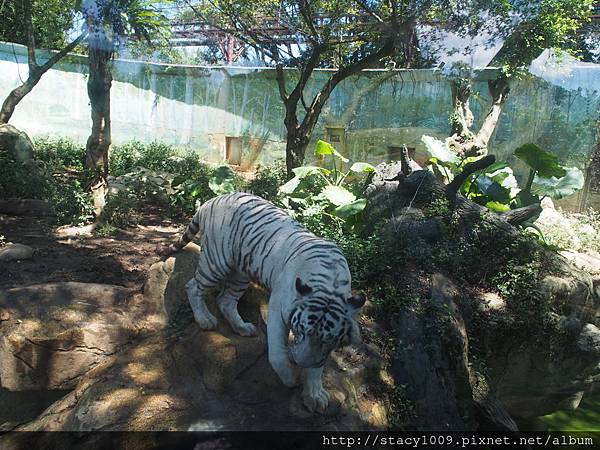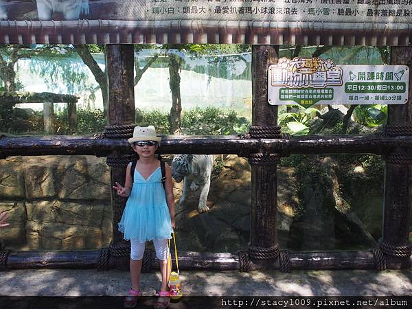 從透明玻璃近距離欣賞白老虎,尤其蓉還勇敢地站在牠的前方拍照留念,